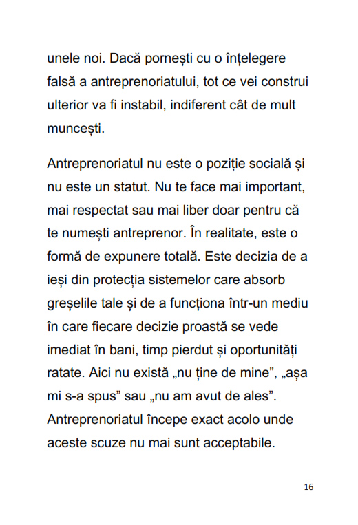 Cartea explică clar de ce majoritatea oamenilor rămân blocați într-un sistem care le oferă doar o siguranță aparentă și de ce antreprenoriatul nu este doar despre bani, ci despre asumare, disciplină și control asupra propriilor decizii.