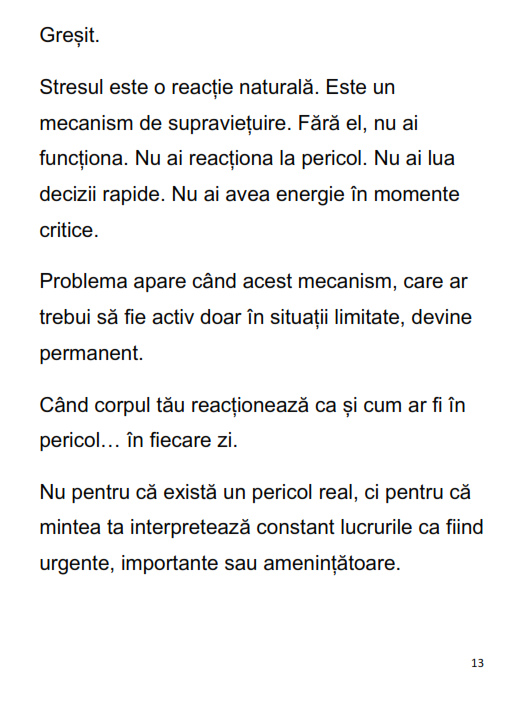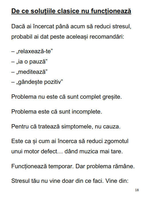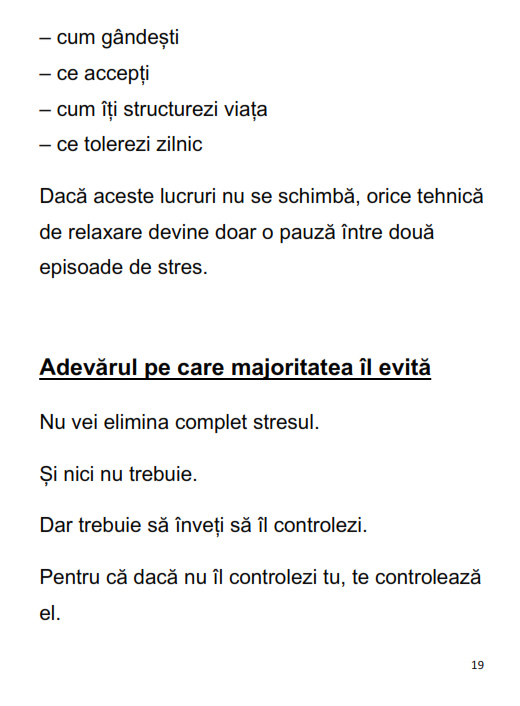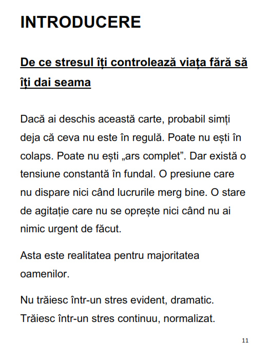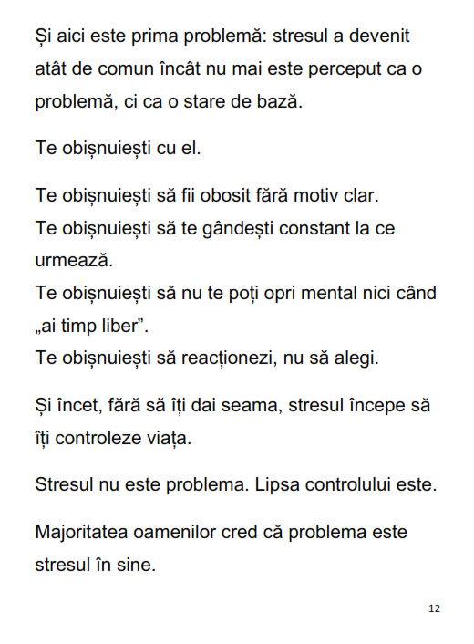 Cartea îți arată clar diferența dintre a fi ocupat și a avea control, dintre a reacționa și a acționa conștient. Nu îți promite o viață fără stres. Îți oferă ceva mult mai valoros: control asupra lui.