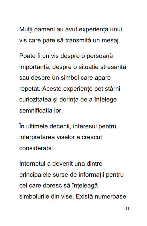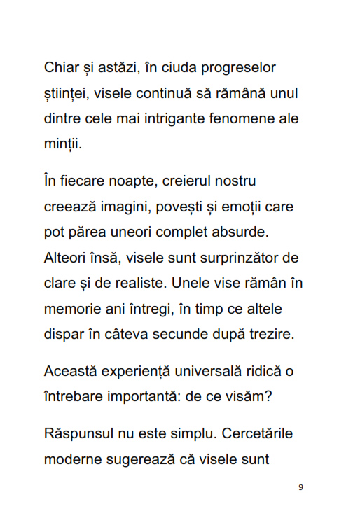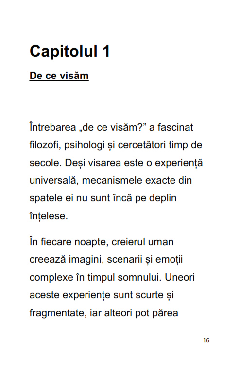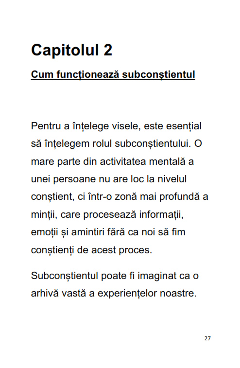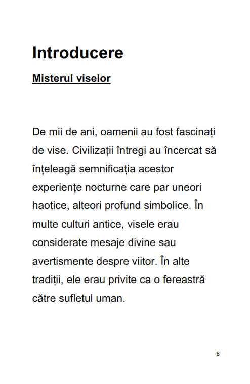 Ebookul "Ghidul Complet al Interpretarii Viselor" este o introducere clara si accesibila in lumea viselor si a simbolurilor din subconstient. Cartea explica de ce visam, cum functioneaza mintea in timpul somnului si cum pot fi interpretate cele mai frecvente tipuri de vise.