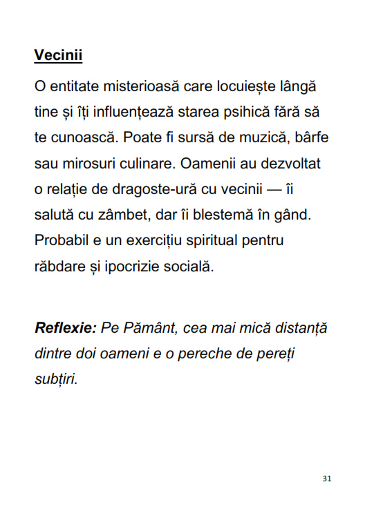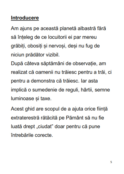"Ghidul extraterestrilor în lumea oamenilor" este o invitație la a privi realitatea cotidiană cu ochi noi și la a descoperi cât de neobișnuită poate deveni lumea atunci când cineva pune întrebările pe care oamenii au încetat de mult să le mai pună.